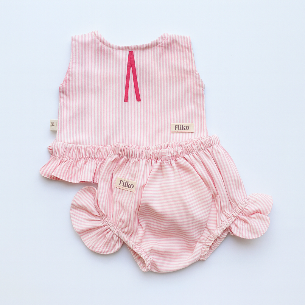 Conjunto confeccionado en poplin rayado rosa y blanco con volados.