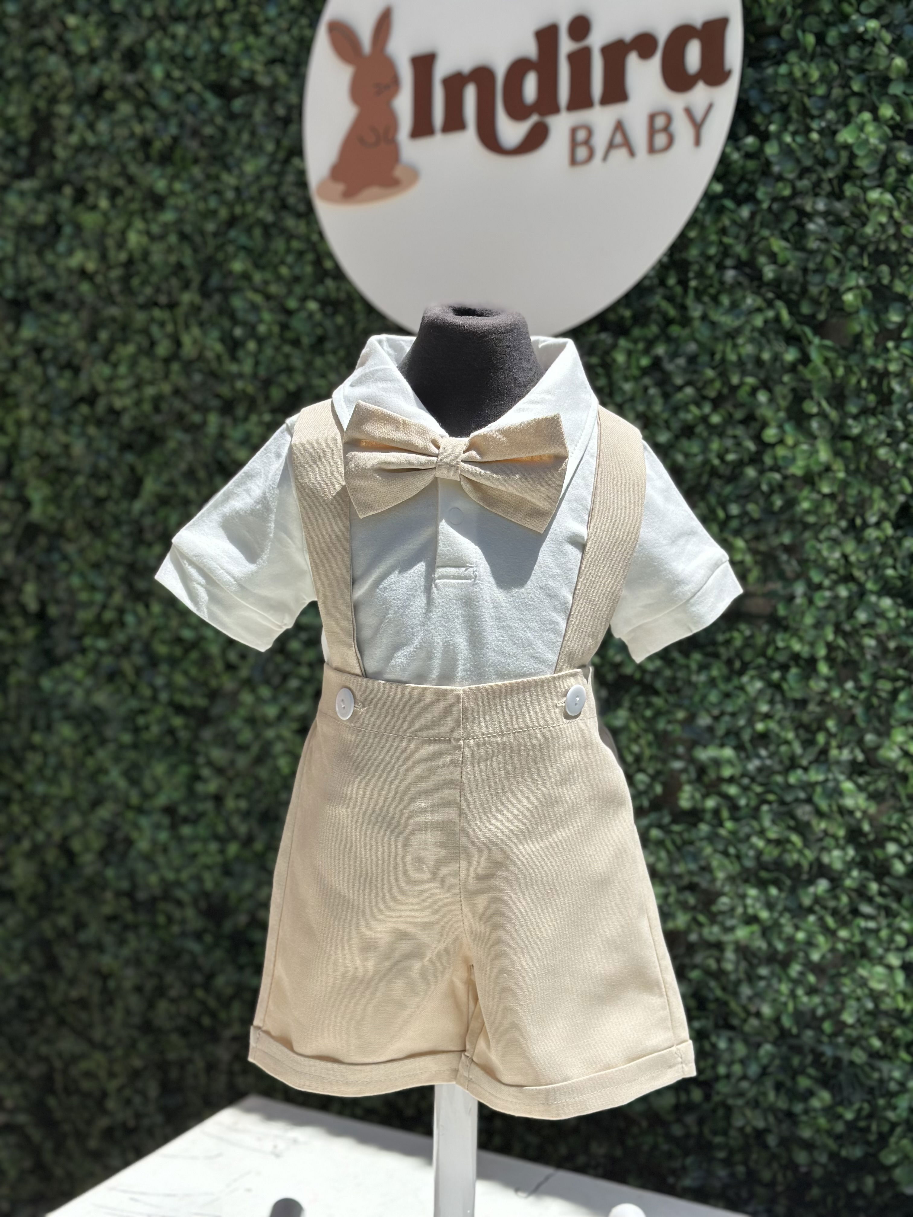 Conjunto de body de algodón y pantalón de lino con tiradores y moño.
